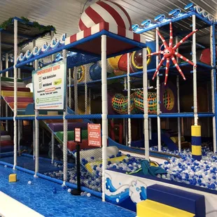 The kids and I were offered tickets here as a gift--we'd been meaning to get out this way, so it was a much anticipated visit and did not disappoint.We passed it at first; although right off of Duquesne with a streetside sign, Ocean Adventures is in a very unassuming warehouse-esque metal building. That almost sets you up for more of a pleasant surprise when you walk inside after parking in the gravel lot behind the building (technically the front). When you walk in there are cubbies and coat hooks to deposit your things. The front desk is also right there, so not a lot of concern about things being stolen.Everyone gets a wrist band as you check in, and for the more uncooperative kiddos (one of mine) an ID sticker on their back.I didn't know this when I got there, but tickets are typically purchased in advance online as they only sell 40 tickets per session to keep it enjoyable for everyone--a policy I personally really appreciate, especially with little kids. And the unbelievable part: the tickets are only $5 T-Th and $6 F-Su. (If an adult wants to play with their kiddo, they also need a ticket, but for so little that's not a big deal for us, especially compared to prices at other kids facilities in SWMO/NWA). The facility itself: amazing. Imagine the McDonalds playset from your childhood, but without the dirty sock smell, multiple stories, more slides and a bigger ball pit. It's clean and actually smells GOOD...you can go on their website and watch/read about the cleaning routine. It's pretty impressive and the condition of the facility reflects that. I also noticed the staff making rounds every so often around the play equipment, which I also appreciated. The bulk of the play equipment is made of various nets and ropes/clear plastic windows, so your kids are almost always visible, but it's nice to see that the staff are kind of monitoring to make sure everything is in order. We really loved our visit here, our 2 hours flew by and as the kids get a little older this would be a great place to bring a book and relax at a table while they play...it's one of the few places around that feels safe enough for my comfort and entertaining enough for theirs. Until then, though, I am enjoying my excuse to "have to" play in a giant ball pit.