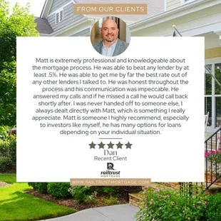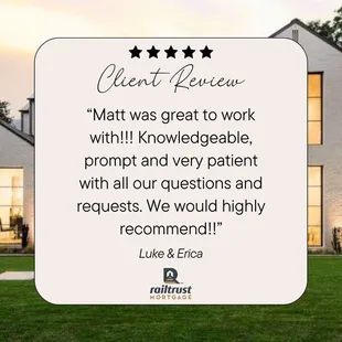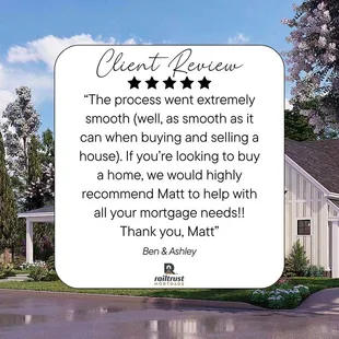 Excellent customer service! I felt like Matt really listened to what I needed and helped me with every step of the mortgage process!