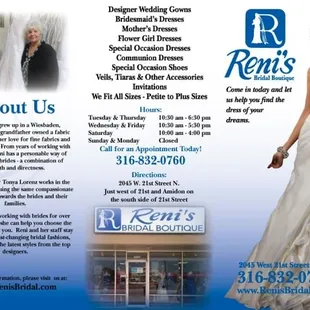 I cannot say enough wonderful things about the selection of gowns, the kindness of the staff and the expertise on weddings! We ran into Reni's booth at the bridal fair and decided on a whim to check them out, even though my daughter though she had already found her dress. Boy were we wrong. We felt the love and warmth the minute we stepped into the door and by dress 2, we KNEW we had found the right one! Excellent prices and the best selection in Kansas! Thanks ladies!!Sally and Ashley Liebst