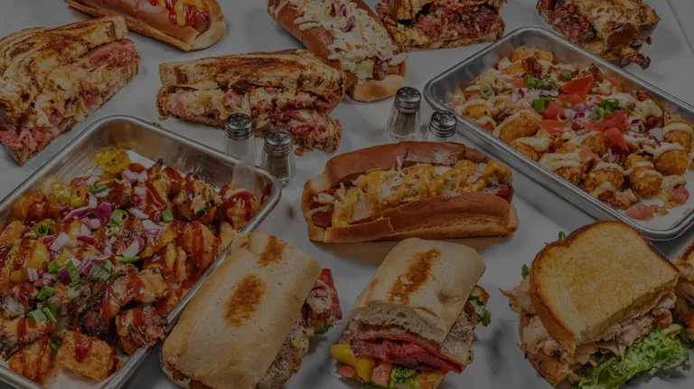 Italian sandwich, Reuben sandwich, pastrami poutine tots. Slaw, pickle, and cookie