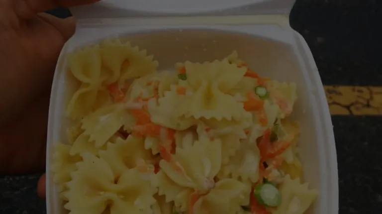 a hand holding a container of pasta
