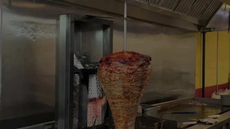 a large kebab being cooked in a commercial kitchen