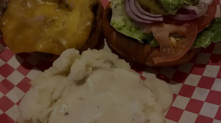 My burger with cheddar cheese and added avocado, and mashed potatoes with gravy.