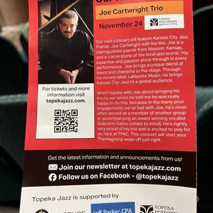 Topeka Performing Arts Center (TPAC) has been the home for the Topeka Jazz Workshop (TJW) since its post-Covid return. Before the height of Covid, TJW held performances at the nearby Ramada hotel. TPAC is an older venue and could use some small updates like paint, but that's a very small complaint. The staff is all really nice and welcoming. The concession area is nicer than other concert venues, and the prices aren't outrageous. TJW meets in one of the ballrooms downstairs and the lighting and sound are very well done. There are nearby restrooms, but the doors leading from the ballroom to the hall by the restrooms are oddly loud- definitely jarring and annoying during a show. TJW is held on Sundays and parking is free- there's a parking lot as well as metered parking. I'm assuming that the meters aren't free during the week.